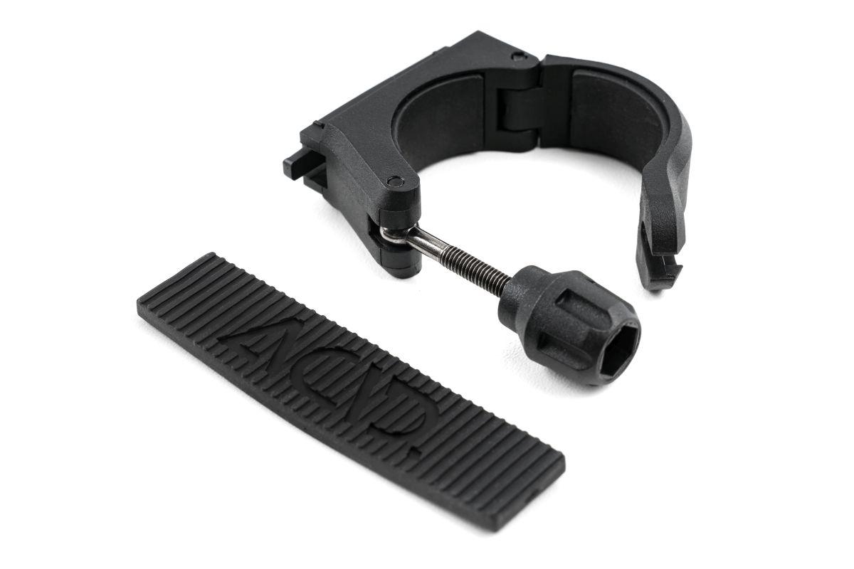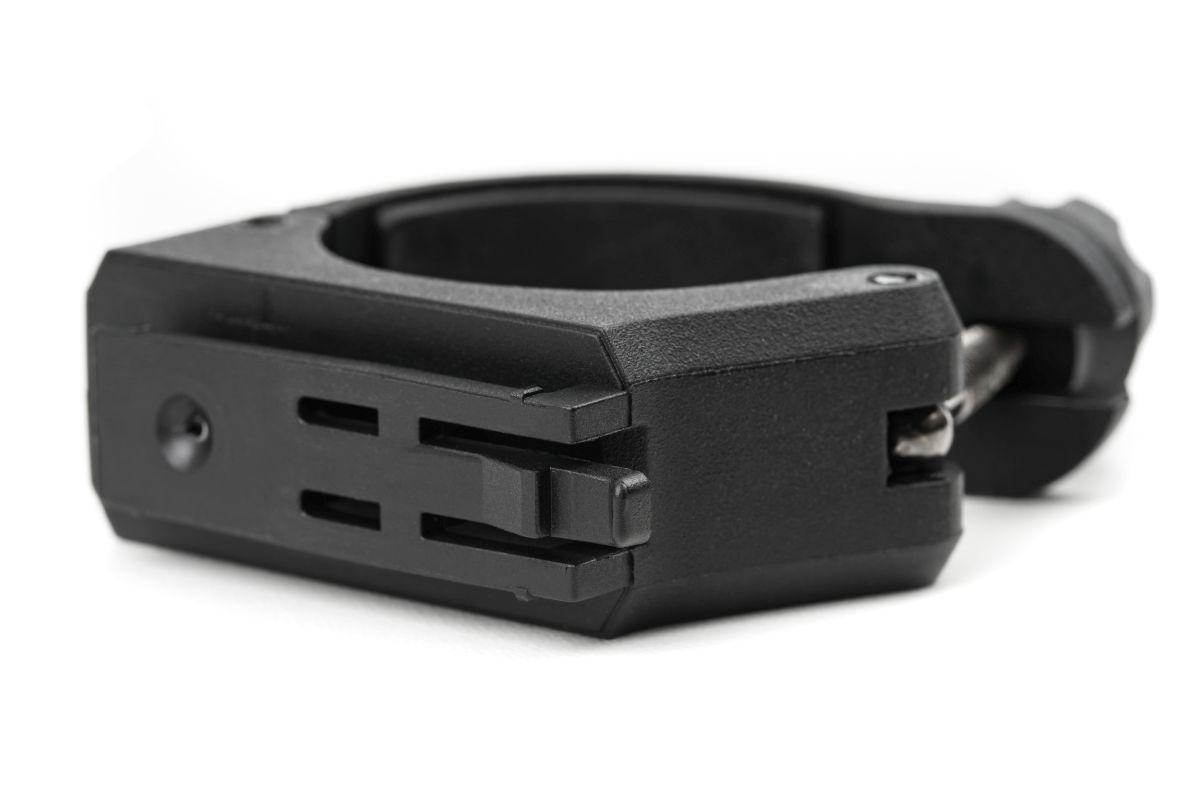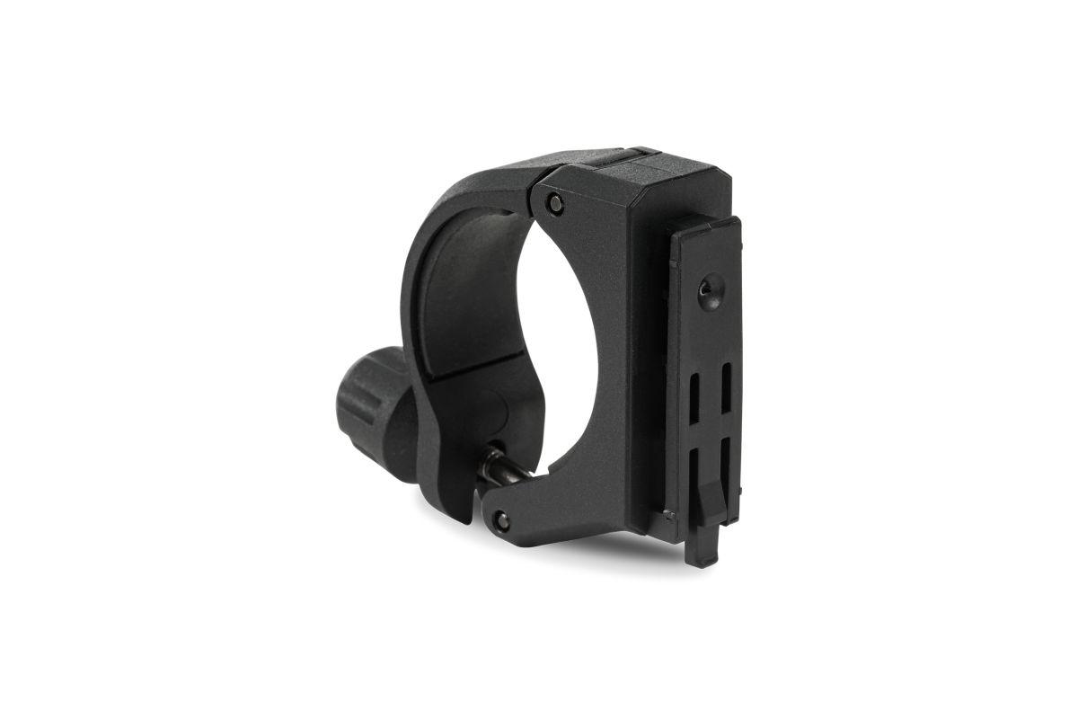 Lichthalter für ACID Frontlicht PRO 80. Die universelle Halterung lässt sich mit der werkzeuglosen Schraubmontage bequem und sicher an Rohrdurchmessern zwischen 25 und 35 mm befestigen.