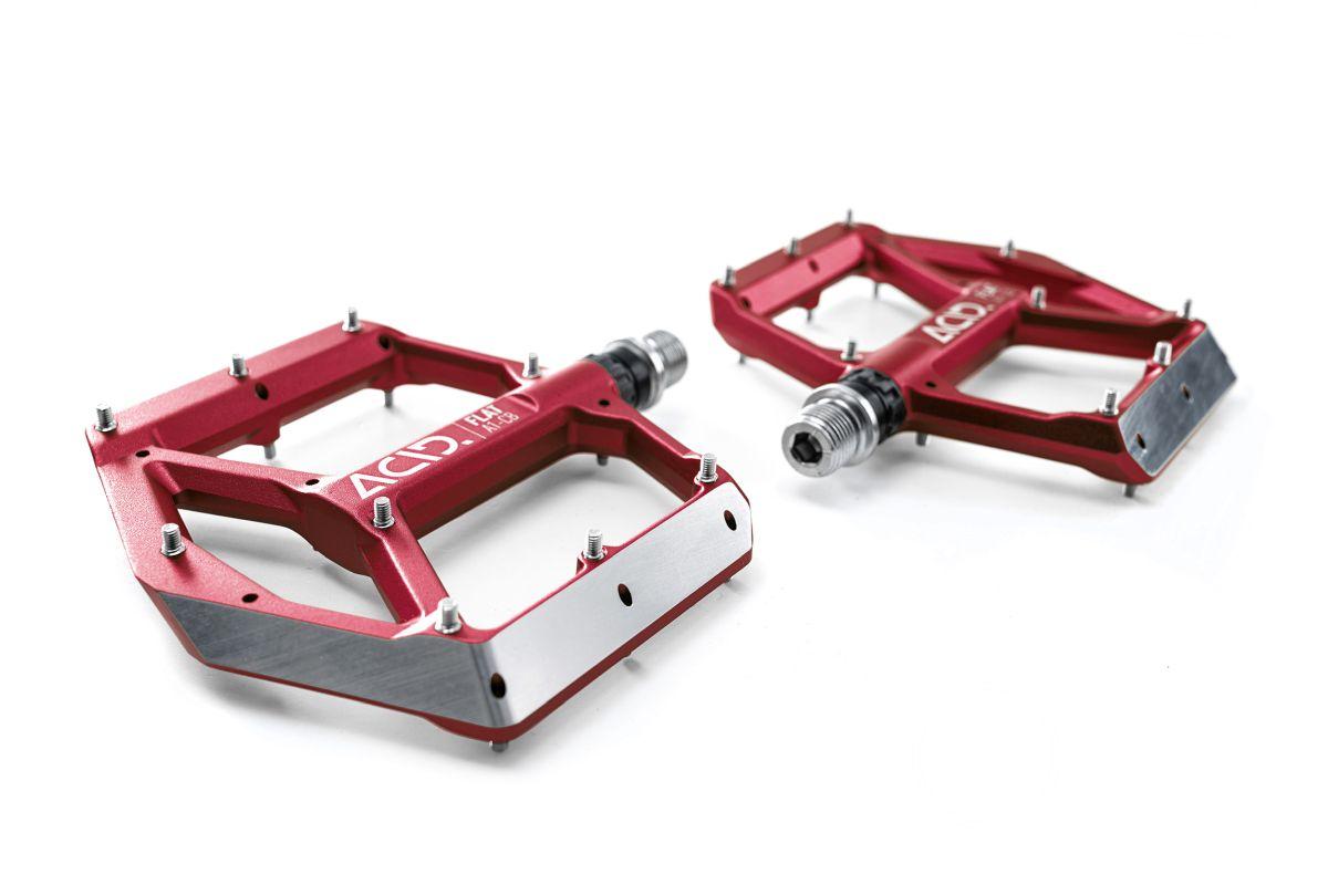 leichtes Flat-Pedal, CNC-veredelter Aluminiumkörper und CrMo Achse, angefaste Kanten für erhöhte Bodenfreiheit in Kurven, große Standfläche, extrem flache Bauweise, neun austauschbare und einstellbare Pins pro Seite, gedichtetes Patronengleitlager und zwei gedichtete Industrielager