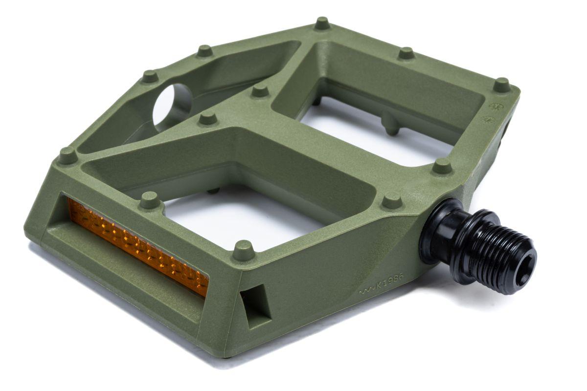 leichtes Flat-Pedal, Nylon-verstärkter-Kunststoff-Körper und CrMo Achse, angefaste Kanten für erhöhte Bodenfreiheit in Kurven, große Standfläche, flache Bauweise, zwölf Pins pro Seite, LSL-Bushing, integrierte Reflektoren