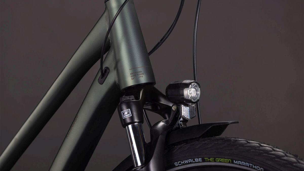 Aufsitzen, antreten und die Tour genießen: Mit dem schlichten Kathmandu ONE von CUBE bekommen Entdecker einen robusten und flexibel anpassbaren Alleskönner unter den Sattel. Auf dem stabilen, vielseitigen integrierten Gepäckträger IC 3.0 findet alles Platz, was unterwegs mit muss. ACID Schutzbleche, Vorder- und Rücklichter und ein Flat Mount Seitenständer sind auch mit dabei. Dazu hat die einfach bedienbare Cues 2x9-fach Schaltung aus dem Hause Shimano in jeder Situation den passenden Gang im Angebot. Ebenso von Shimano kommen die hydraulischen Scheibenbremsen für sicheres Verzögern und Anhalten bei jedem Wetter. Angenehmer Fahrkomfort, auch auf holprigen Wegen, ist das Spezialgebiet der Suntour Federgabel. Umweltbonus: Die spezielle Gummimischung der Green Marathon Reifen von Schwalbe besteht zum Großteil aus recycelten Altreifen – für nachhaltige Mobilität auf allen Wegen. Da kann's doch direkt losgehen, oder?