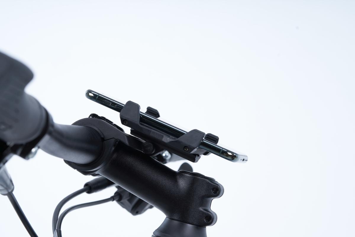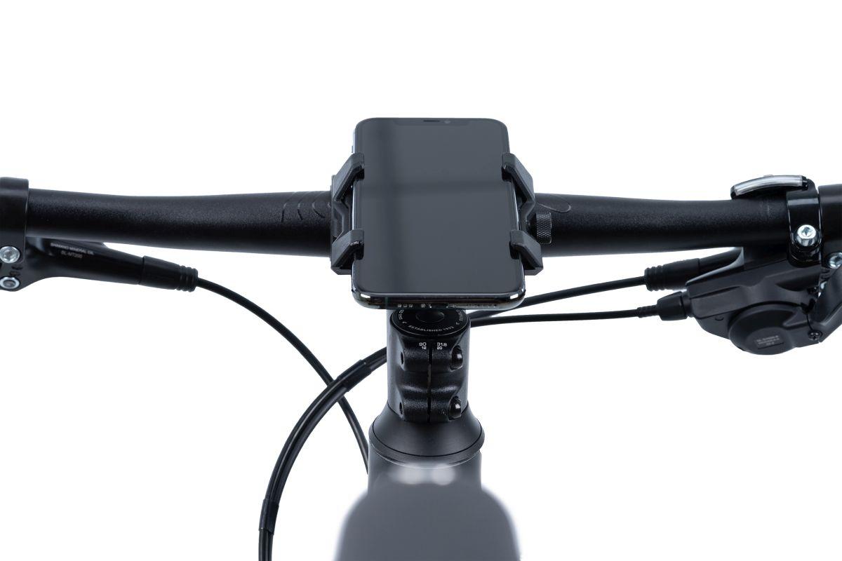 Variabel verstellbare Handyhalterung, für Breiten von 58 - 87mm, max. Handyhöhe: 11,5cm, quer und längs verstellbar durch Drehung, Längsposition stufenlos verstellbar, Winkel verstellbar, Handy mittig auf dem Vorbau, fester Halt durch Silikonpads