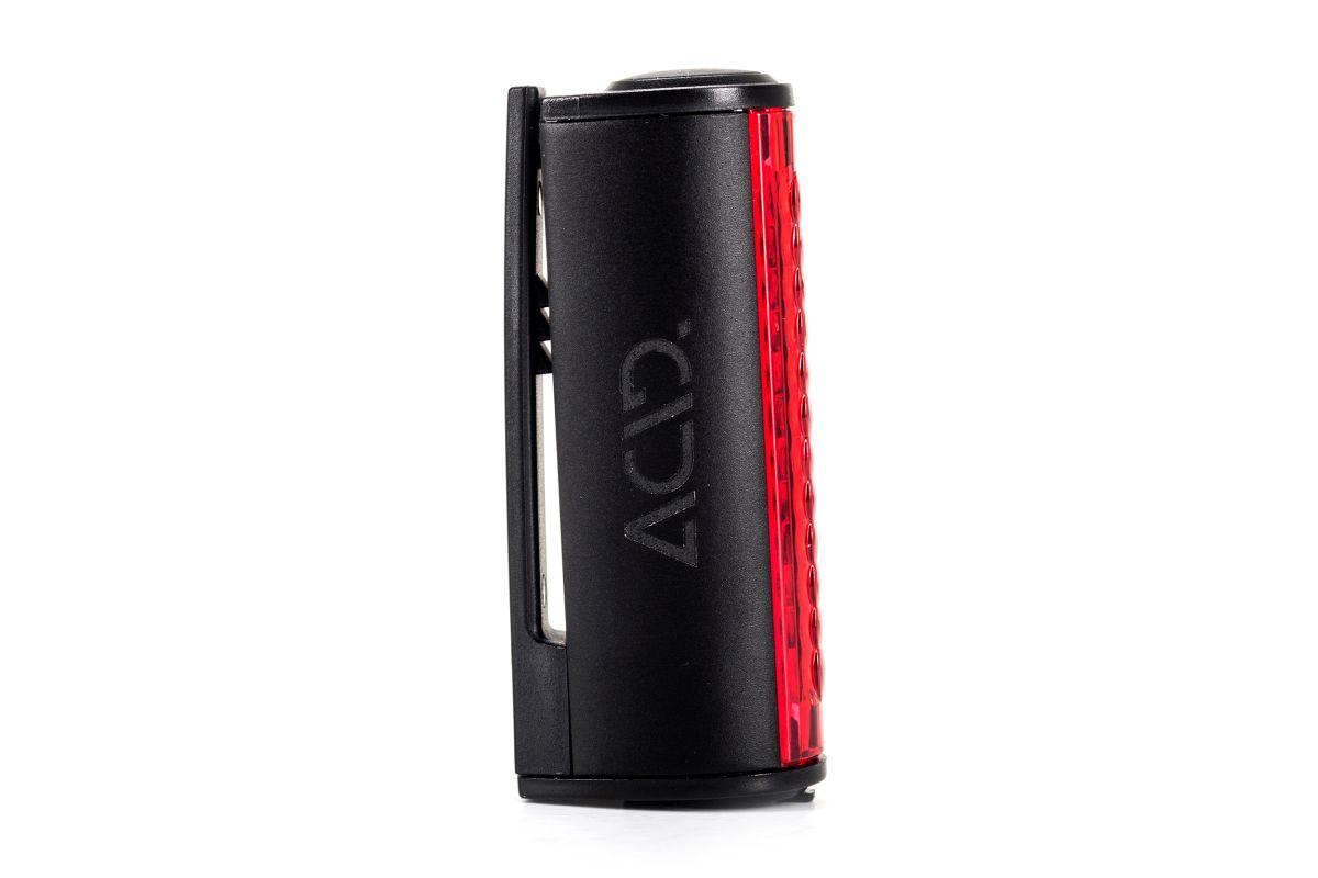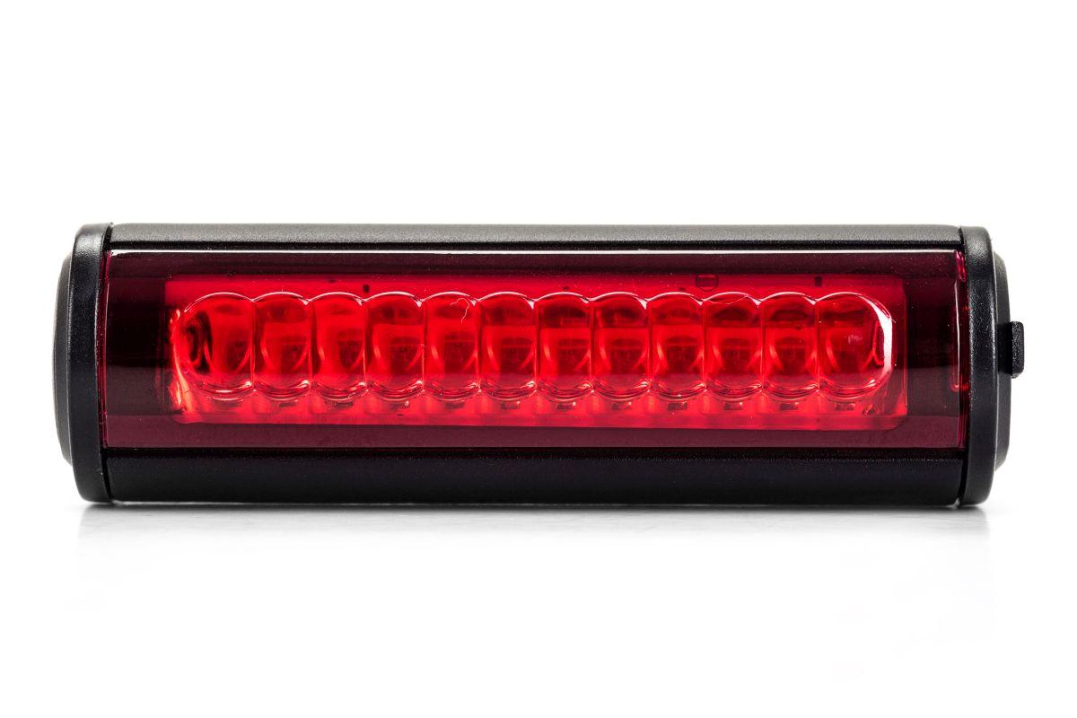 Sicherheitslicht "rot" mit 12 SMD LEDs, 30 Lumen, integrierter Lithium-Polymer-Akku, 6 Lichtfunktionen, 2-stufiger Batterieindikator, spritzwassergeschützt, Silikonbandbefestigung, integrierter Befestigungsclip