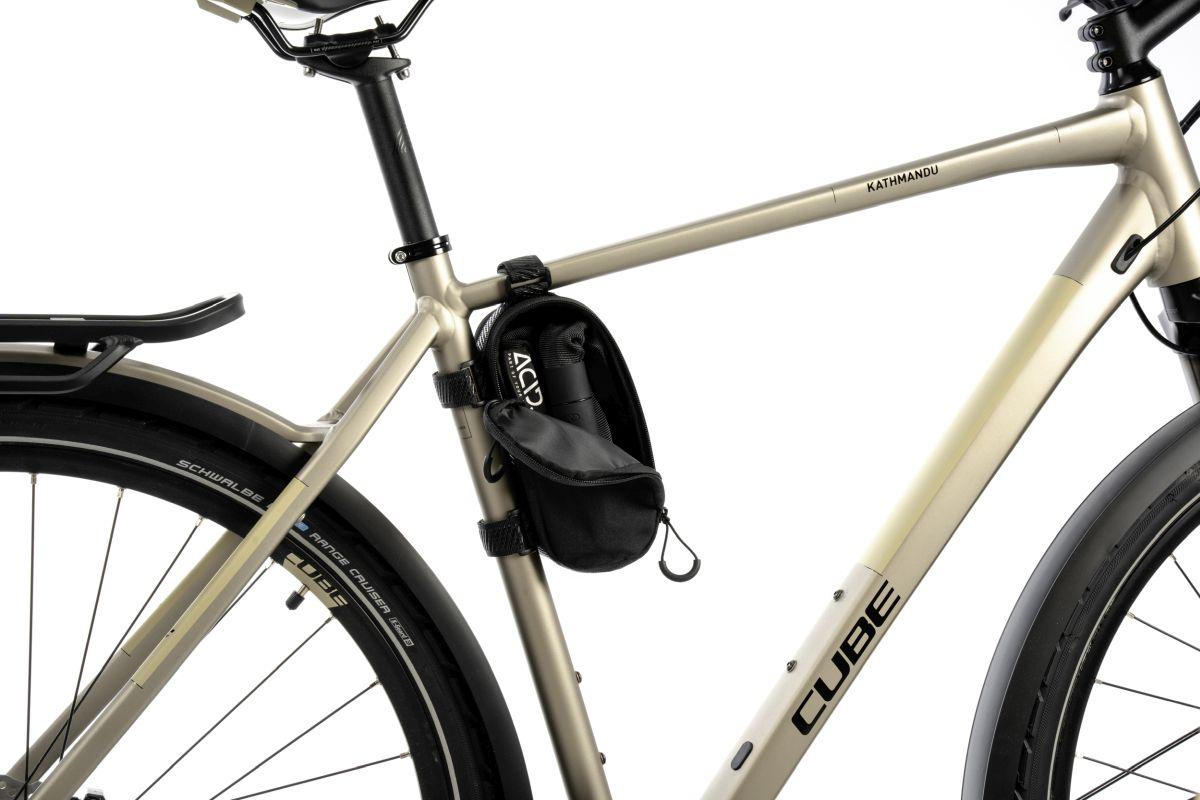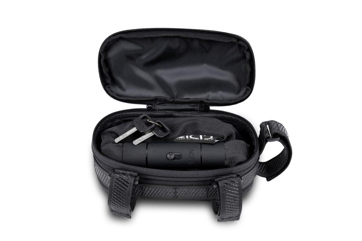 für den geschützten Transport von ACID Kettenschlössern CORVID, abriebfestes Außenmaterial, PVC-frei, flexible Anbringung durch umlaufendes Molle System, inklusive Anti-Rutsch Klettbänder, inklusive Rahmenschutzstreifen, reflektierende Elemente