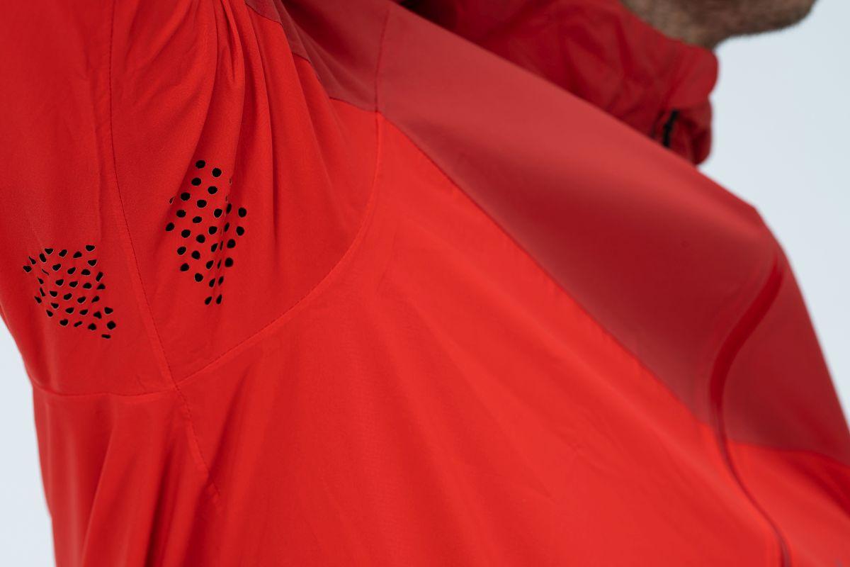dauerhaft wasserabweisendes 2,5-Lagen-Funktionsmaterial, durchgehender wasserabweisender Frontreißverschluss, getapte Nähte, Saum verstellbar durch integrierten Kordelzug, Aussparung am Saum um Ballon-Effekt bei eng gezogenem Saum zu vermeiden, verstellbare Kapuze mit zusätzlichem Schirm, Kapuze eignet sich zum Tragen unter dem Helm, Seitentaschen mit verdecktem Reißverschluss, Perforation zur Ventilation unter den Armen, elastischer Ärmelsaum, reflektierende Elemente