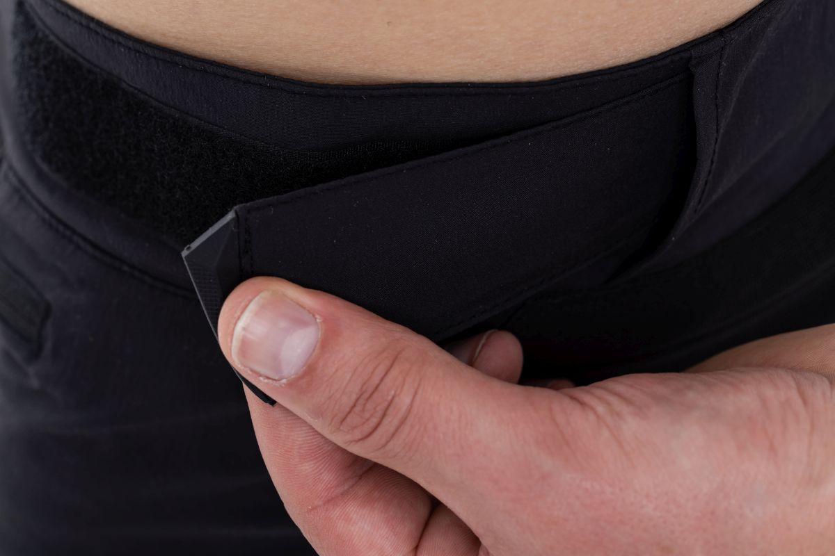verstellbare Bundweite über seitlichem Klett, Tasche mit Reißverschluss, vertärkter Kine- und Gesäßbereich, elastische Einsätze, Ventilationszonen, Innenbund mit rutschefestem Silikondruck, Model ist 186 cm groß und trägt Größe L
