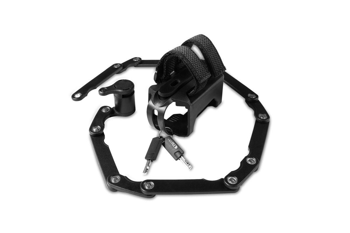 Das sowohl hochsichere als auch handliche Faltschloss ist 780 mm lang und überaus funktional bei geringem Packmaß. Die Kunststoffbeschichtung schützt den Rahmen vor Kratzern und das Schloss vor Korrosion, inkl. zwei Schlüssel und Halterung.